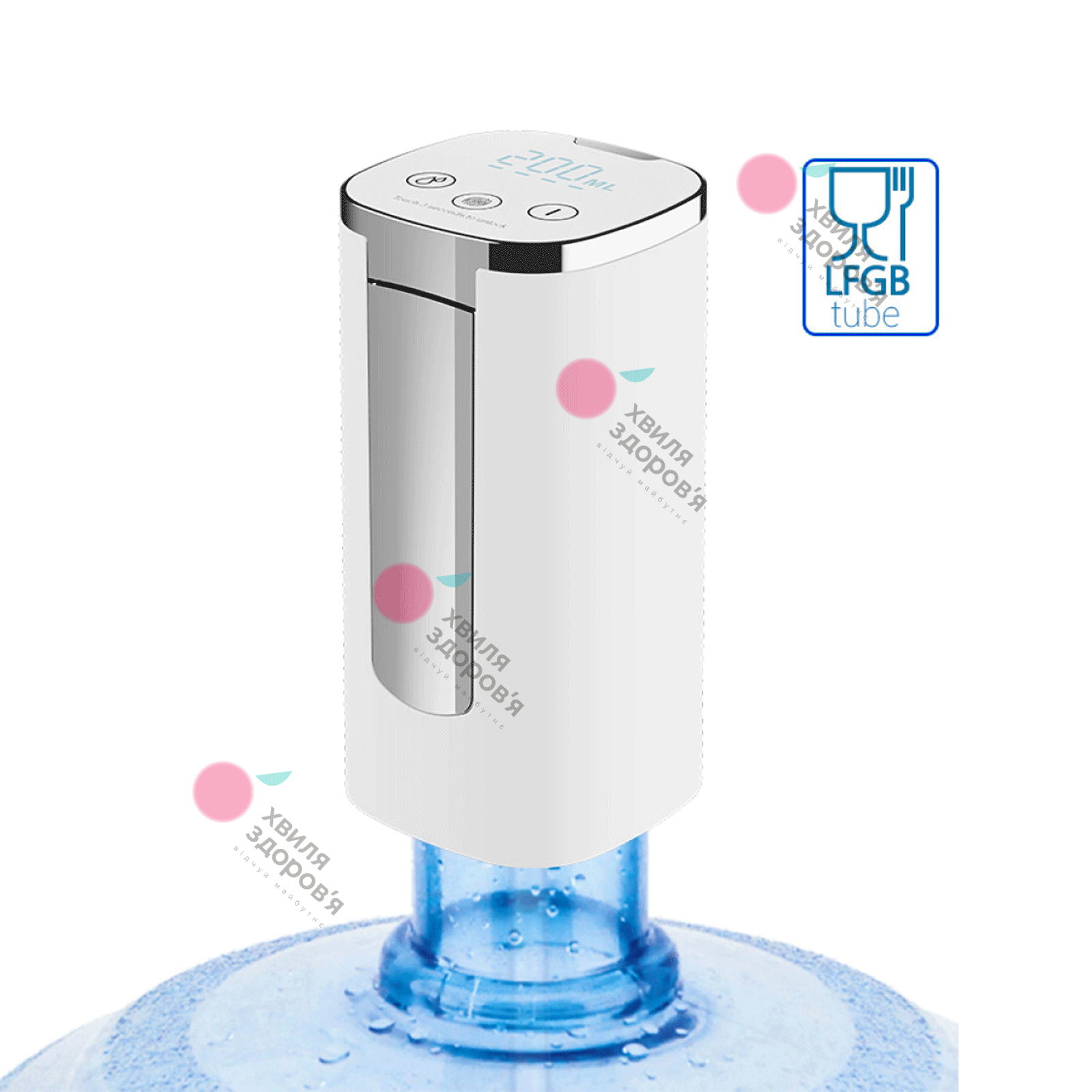 Окремо варто відзначити, що трубочка насоса виконана з первинного харчового силікону LFGB. Цей матеріал не впливає на смак води та абсолютно безпечний для здоров’я.