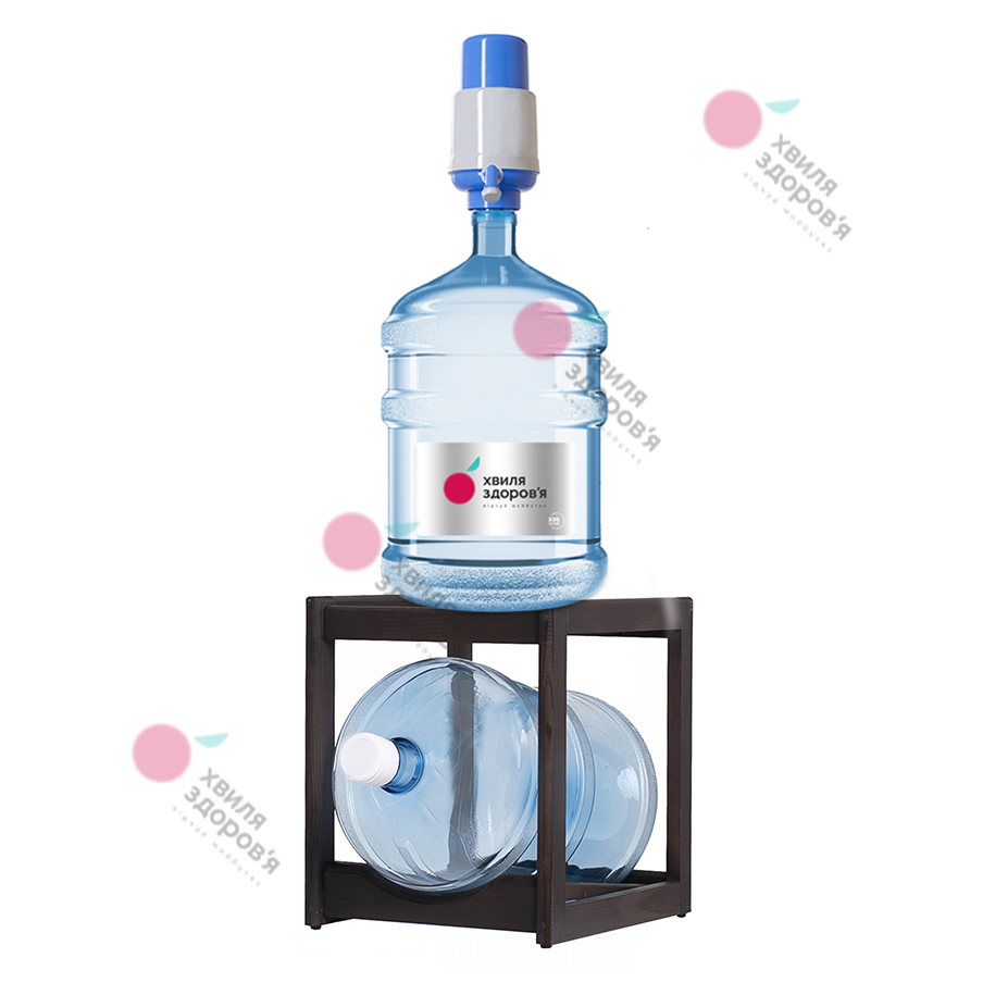 Підставка виконана з дерева у прямокутній формі, низька. Можна розмістити 1 бутиль стандартного 18,9 л розміру, зверху полиці поставити диспенсер з водою або бутиль з помпою. Дуже компактна та стійка. Колір – венге. Розміри (висота, ширина, довжина) – 46 х 33 х 37 см.