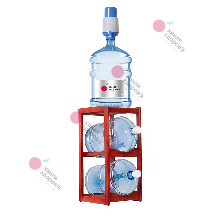 Полка дерев’яна під 2 бутлі об’ємом 18,9 л, виконана в прямокутній формі. Колір – вишня. Розміри (висота, ширина, довжина) – 80 х 33 х 37 см. Зверху дерев’яної підставки WS-2 можна встановити бутиль з помпою, диспенсер або настільний кулер для зручності користування, а в нішах зберігати повні та порожні пляшки.Матеріал полиці пройшов процес брашування, що допомогло зберегти структуру деревини. Тонування виконано за допомогою спеціального лаку, який захищає підставку від зовнішніх впливів.