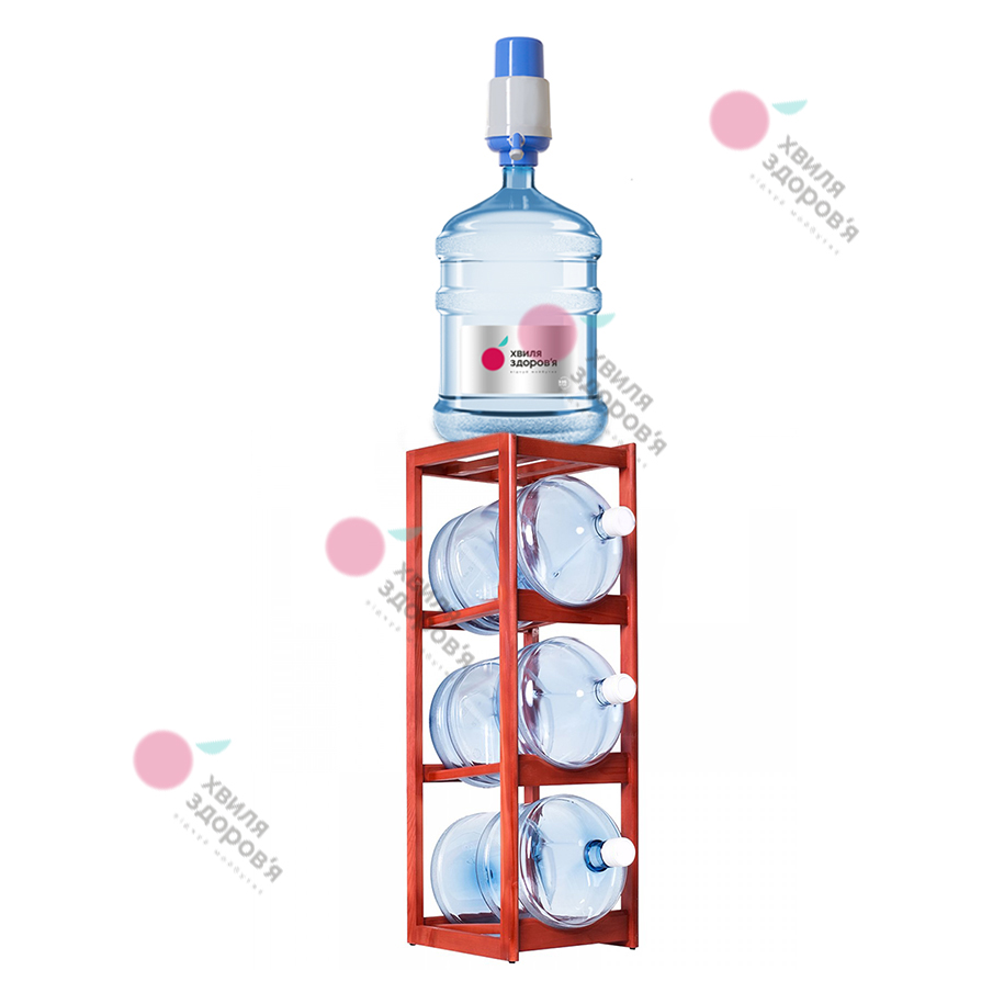 Дерев’яна підставка під 3 бутлі об’ємом 18,9 л, виконана у прямокутній формі. Колір – вишня. Розміри (висота, ширина, довжина) – 105 х 33 х 37 см. Підставка виконана з сосни з якісним окантуванням граней дерева. Поставляється у зібраному вигляді, зручно та якісно упакована. Зверху дерев’яної полиці можна розмістити: керамічний диспенсер; настільний кулер для води; пластиковий диспенсер; четвертий бутиль з водою, з одягненою на нього помпою для води.